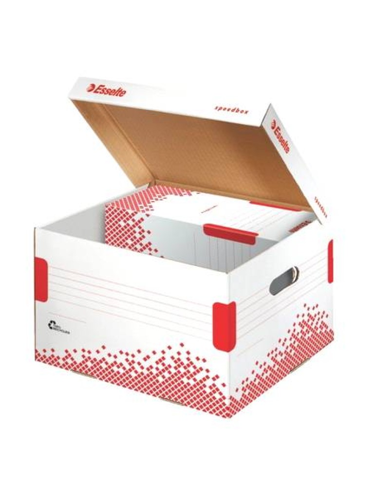 Container arhivare Speedbox, face activitatea de arhivare mult mai usoara si rapida. Sunt fabricate din carton ondulat, cu margini intarite pentru rezistenta in timp si sistem de asamblare foarte usor, prin pliere. Pot fi utilizate atat pentru depozitarea cutiilor si documentlor dumneavoastra, cat si pentru transportarea acestora in siguranta. Caracteristici container arhivare cu capac ESSELTE Speedbox M. Marime: M (medie). Deschidere superioara, capac integrat. Material: carton ondulat, reciclat. Reciclabil: da. Poate asigura depozitarea a 3 cutii Speedbox de 100 mm sau 2 de 150 mm, precum si depozitarea universala a diferitelor accesorii de birou. Mod de asamblare usor de realizat, prin pliere. Dimensiuni (L x l x h): 367 x 325 x 263 mm. Tip margini: ranforsate, consolidate pentru asigurarea unei bune rezistente in timp. Fante de prindere pentru manevrare usoara. Certificare FSC. Green Office va pune la dispozitie o gama variata de cutii si containere de arhivare, cu livrare imediata din stoc, oriunde in tara.